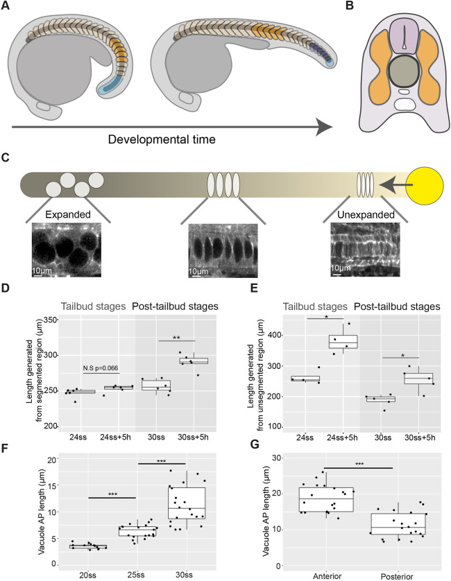 Fig. 1. Axis elongation occurs predominantly in the unsegmented region during tailbud stages and later continues in segmented tissue in zebrafish embryos. (A) Schematic outlining segmented (orange and dark-blue) and unsegmented (light-blue) regions of the somitic compartment. Dark-blue somites are formed from unsegmented tissue as development progresses. (B) Schematic showing axial tissues in a cross-section of the zebrafish embryo. The notochord (dark-grey) is flanked on either side by the somitic compartment (orange) and dorsally by the neural tube (light-purple). (C) Schematic outlining events in notochord morphogenesis. Vacuolation progresses from the anterior (darker) to posterior (lighter) of the notochord and progenitors expressing noto (yellow) add cells to the notochord rod. (D) Length of a region of segmented tissue in tailbud (24ss) and post-tailbud (30ss) embryos and length generated from this region over 5 h (n=6 and n=6, respectively; **P<0.01, Mann–Whitney U test). (E) Length of a region of unsegmented tissue in tailbud (24ss) and post-tailbud (30ss) embryos and length generated from this region over 5 h (n=4 and n=5 embryos per stage, respectively; *P<0.05, Mann–Whitney U test). (F) AP length of vacuoles at different stages of development (n=3, n=4 and n=4 embryos per stage, respectively, 3-5 vacuoles measured per embryo; ***P<0.001, Kruskal–Wallis test). (G) AP length of vacuoles in anterior and posterior regions of 30ss embryos (n=4 embryos, 5 vacuoles measured per region; ***P<0.001, Mann–Whitney U test). Anterior is to the left and posterior to the right in all images. N.S., not significant.