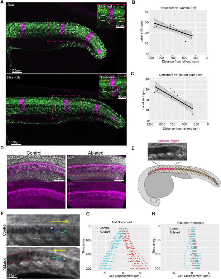 Notochord cell expansion leads to the posterior displacement of notochord cells relative to adjacent axial tissues in zebrafish embryos. (A) Photolabelled stripes (magenta) along the length of an embryo expressing NLS-KikGR at 28ss and 5 h later. White dashed lines in insets show the notochord. (B) Shift between notochord and somite photolabels versus distance from the posterior end of the embryo. (C) Shift between notochord and neural tube photolabels versus distance from the posterior end of the embryo. Black dots indicate measured label shifts, solid line indicates linear regression line and grey shading indicates 95% confidence interval. (D) DAPI and Shh expression in representative control and ablated embryos (n=4 embryos per condition). The boxed area indicates the ablated region. (E) Schematic showing the ablated region (pink) in an embryo entering the post-tailbud stage. Ablations were made at the onset of vacuolation. (F) Expanding notochord cell tracks (track start: dark blue; track end: light green) in control and ablated embryos. Yellow arrows indicate direction of tracks. Pink dashed lines indicate ablated region. (G) Displacement of manually tracked expanded notochord cells in control and ablated embryos (n=6 embryos per condition, 3 tracks per embryo). (H) Displacement of manually tracked unexpanded notochord cells in control and ablated embryos (n=5 embryos per condition, 3 tracks per embryo).