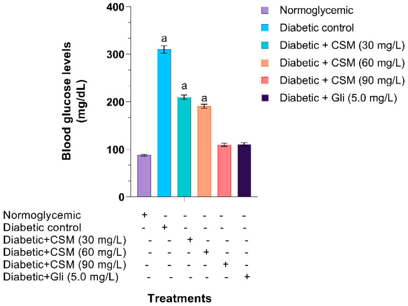 Figure 6. Effect of CSM on blood glucose levels of glucose-induced diabetic zebrafish. Each value represents the mean ± SE. a p ≤ 0.05 when compared to normoglycemic control group. The letter indicate significant differences between the different treatments. CSM; methanol extract from the seed of S. purpurea, Gli; glibenclamide.