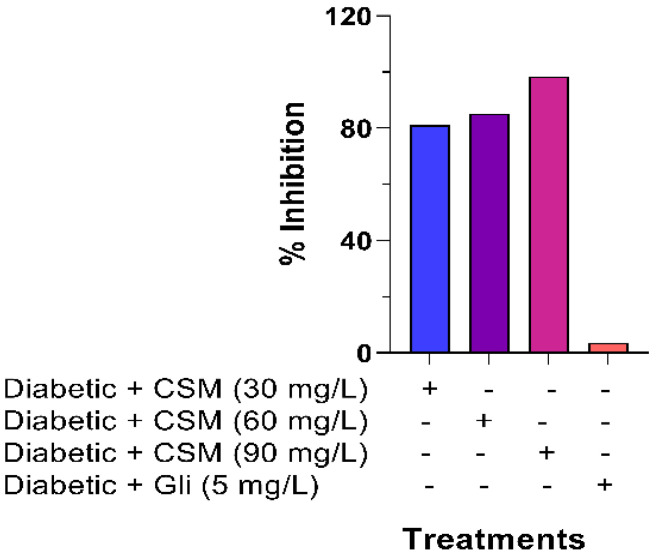 Figure 8. Effect of CSM on AGEs formation at the end of the experimental period (14 days). Values are expressed as a percentage of glycation inhibition. CSM; methanol extract from the seed of S. purpurea, Gli; glibenclamide.