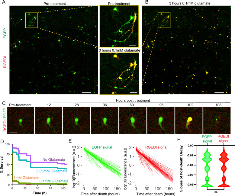 A Representative two-color overlay image from a well of rat primary cortical neurons expressing RGEDI-P2a-EGFP before treatment with 0.1 mM glutamate (Scale = 400 μm) and zoom-in of two individual neurons within the yellow box (Scale = 100 μm). Live neurons appear green/yellow, dead neurons appear yellow/red. B Representative two-color overlay image from neurons 3 h after treatment with 1 mM glutamate and enlargement of the same two neurons within the yellow box in (A). Scale = 100 μm. C Time-course images of a neuron before and after exposure to 0.1 mM glutamate that survives until 96 h post-treatment (Scale = 50 μm). Experiments A–C were repeated on 16 wells with similar results. D Kaplan–Meier plot of neuron survival after exposure to 1, 0.1, 0.01 mM, and 0 glutamate (n = 699, 585, 527, 476). E Linear regressions of decay of EGFP (left) and RGEDI (right) after neuronal death marked by GEDI signal above the threshold. F Slopes of decay of EGFP and RGEDI signals are not different (Mann–Whitney, two-tailed, ns not significant, p = 0.93, n = 5513). Horizontal lines in the violin plots represent quartiles and median.