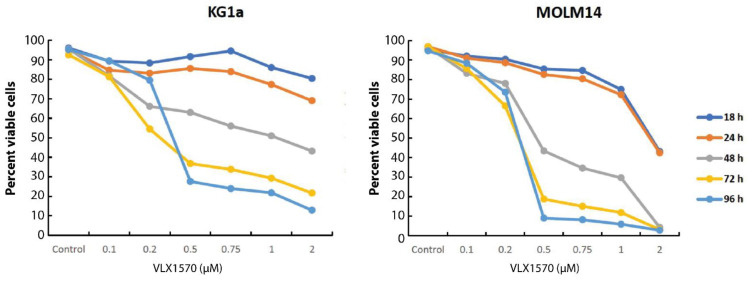 Figure 2 Figure 2. Time- and dose-dependent loss of viability of MOLM-14 and KG1a cells exposed to VLX1570. Cell viability was determined using acridine orange/propidium iodide staining.