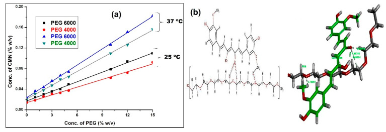 Figure 1. (a) Phase solubility curve of CMN in MilliQ water at 25 and 37 °C in the presence of PEG; (b) molecular modeling for the 1:1 complex of CMN: PEG; two and 3D illustrate the structures of enol form of CMN on the monomer displaying hydrophobic interaction of phenolic OH group. (Green tubes denote the monomer piece of CMN, and Grey tubes denote PEG; dotted lines indicating the most significant bonds, the distances are revealed in Å units).