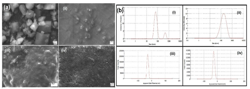 Figure 5. (a) SEM image of (ai) Pure CMN, (aii) PEG 6000, (aiii) HM-SC and, (aiv) HME-SC, and (b) DLS study; particle size of (bi) CMN-PM, (bii) CMN-SC, the zeta potential of (biii) HM-SC and (biv) HME-SC.