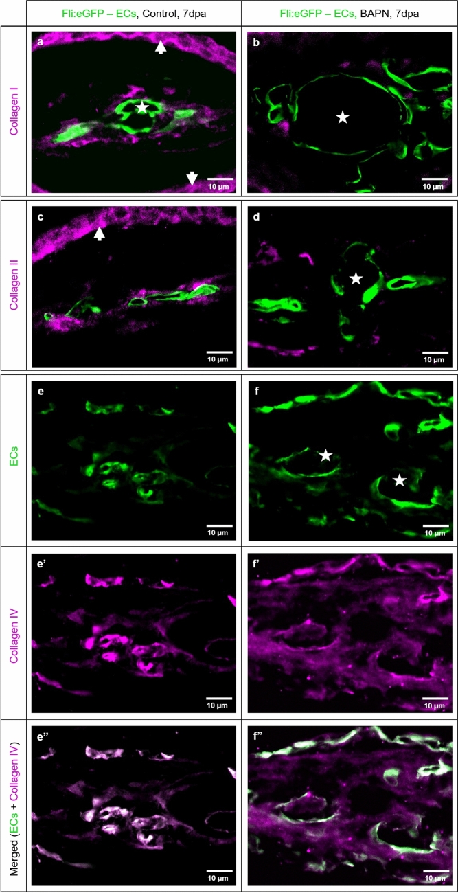 Collagen cross-linking inhibitor BAPN affects collagen I, II and IV accumulation, appearance and distribution. Double immunofluorescence staining revealed the relationship between the new formed blood vessels and collagen I, II, IV distribution in control (left panel: