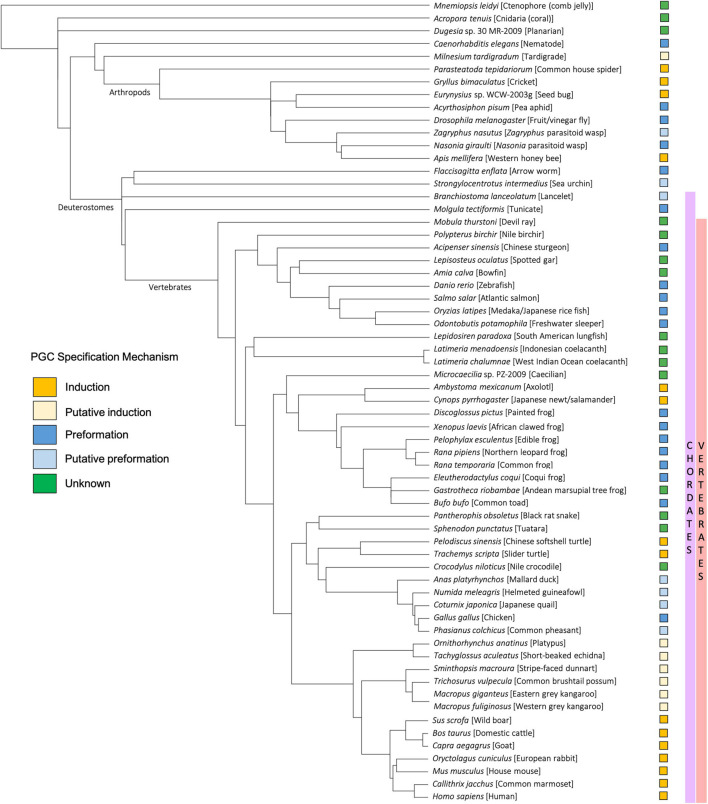 FIGURE 4 Taxonomic tree generated using the NCBI Common Tree Taxonomy Browser and Interactive Tree of Life (Letunic and Bork, 2021) to depict each species or clade referenced in this manuscript. Primordial germ cell (PGC) specification mechanism of each species is indicated according to key.