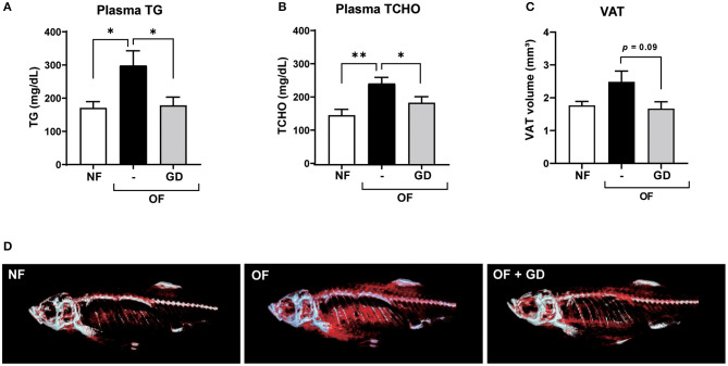 Effects of GD pre-administration in diet-induced obese adult zebrafish. GD suppressed an increase in plasma triglyceride (TG)