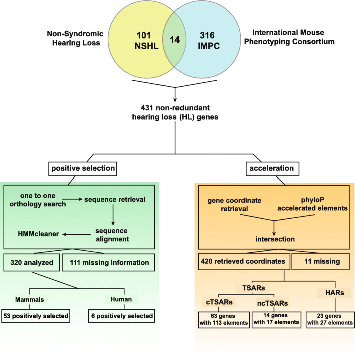 Bioinformatics pipeline and filtering process of two datasets of hearing loss genes: the classic dataset composed of non-syndromic hearing loss genes identified in humans which is composed of a total of 129 coding genes obtained by combining the information available in the “Hereditary Hearing Loss Homepage”