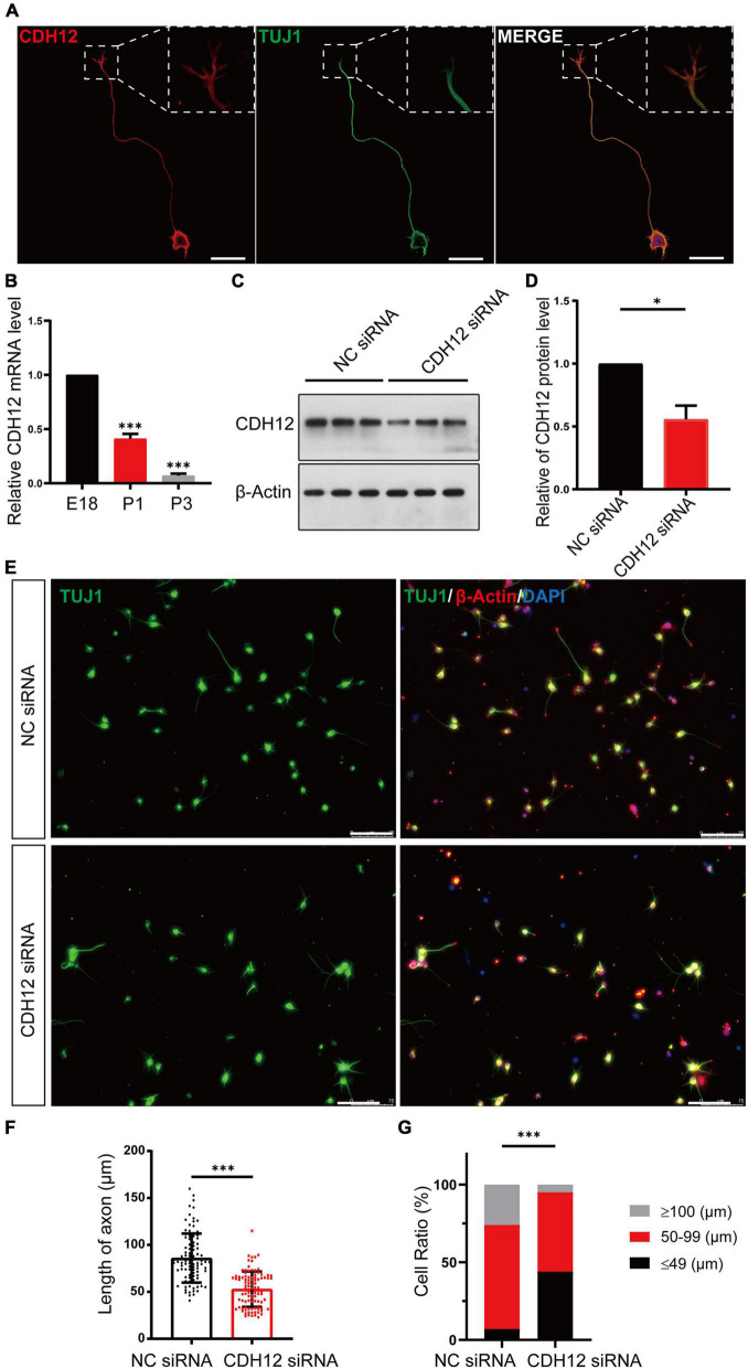 CDH12 knockdown decreased neurite outgrowth in E18 neurons. (A) Representative images of immunofluorescence staining showing the expression of CDH12 in the cell membrane of the cell body, axon, and growth cone. The white dashed box shows an enlarged view of the growth cone. The scale bar represents 25 μm. (B) The mRNA level of CDH12 in cortical neurons decreased gradually with development (E18, P1, P3) as detected using real-time PCR. The level of CDH12 mRNA in E18 neurons was normalized as 1. The data were shown as mean ± SE, n = 3, ∗∗∗P < 0.001. Western blotting (C) and statistical (D) results showing the effectiveness of small interfering RNA in knocking down CDH12 expression. β-actin was used as a loading control. The value of CDH12/β-actin in NC siRNA treatment was normalized as 1. The data were shown as mean ± SE, n = 3, ∗P < 0.05. (E,F) CDH12 knockdown significantly decreased axon growth in E18 neurons after CDH12 siRNA treatment for 36 h. The scale bar represents 75 μm. The data were shown as mean ± SD, n = 96, ∗∗∗P < 0.001. (G) The ratio of neuronal development (with different axonal lengths) was affected by CDH12 knockdown. n = 100, ∗∗∗P < 0.001 (two-way ANOVA).