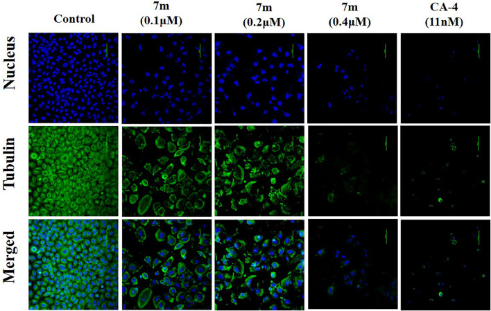 Immunofluorescence assay analysis of the effect of compound 7m on the cellular microtubule network after treatment with DMSO (control) or 7m at the indicated concentrations (0.1, 0.2, and 0.4 µM) for 24 h. Microtubules and unassembled tubulin are shown in green, and DNA is shown in blue.