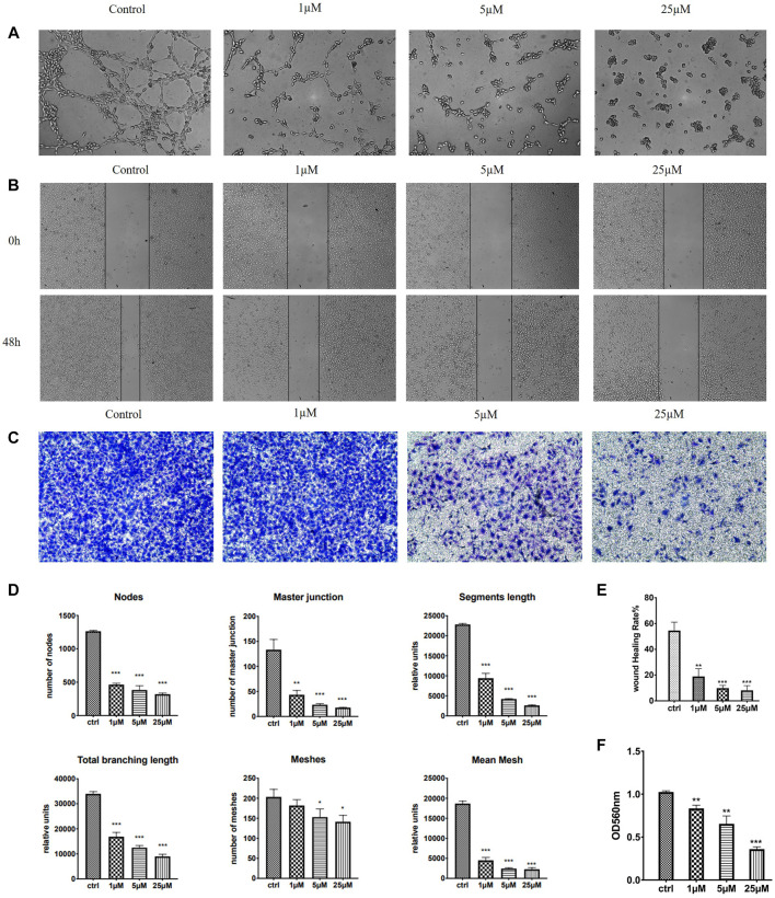 Effect of 7m on the human umbilical vein endothelial cells (HUVECs) migration, invasion, and tube formation. (A) Representative images depicting the vascular structure formation of HUVECs by treatments with 7m for 6–8 h. (B) Scratches were created and images were captured using phase-contrast microscopy at 0 and 48 h after treatments with 7m at different concentrations (1, 5, and 25 µM) or 1% DMSO. (C) The invasion suppressing effects of 7m against HUVECs by Transwell assay. (D) Quantitative evaluation of indicated concentrations of 7m on standard parameters of HUVEC tubule formation. Mean ± SEM of three experiments. **p < 0.01; ***p < 0.001 (E) Inhibitory rates of 7m on the HUVEC migration. (F) Quantitative analysis of the migration ability. *p < 0.05, **p < 0.01; ***p < 0.001, vs. control; n = 3.
