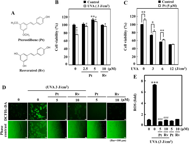 Fig. 1 Pterostilbene improved HaCaT cell viability but repressed UVA-induced intracellular ROS production. (A) Chemical structures of Pterostilbene (Pt) and Resveratrol (Rv). (B–C) Cell viability was calculated by the MTT method. HaCaT cells were pre-incubated with Pt (0–5 μM) or Rv (10 μM) for 24 h followed by irradiation with 3 J/cm2 UVA (B). HaCaT cells were treated with or without Pt (5 μM) for 24 h and then irradiated with different UVA intensities (0, 3, 6, or 12 J/cm2) (C). Cells neither treated with Pt or Rv or UVA-irradiated were considered as the untreated control. (D–E) HaCaT cells were pretreated with Pt (5 μM) or Rv (10 μM) for 24 h, followed by irradiated or not with 3 J/cm2 UVA. The intracellular ROS levels were indicated by DCF and measured by fluorescence microscopy (200× magnification) (D). Fluorescence intensity of the DCF-stained cells for each condition was quantified by Olympus Softimage solution software, and data were denoted as fold difference over untreated control values (E). Cells neither treated with Pt or Rv or UVA-irradiated were considered as the untreated control. Results were denoted as mean ± SD of three or more independent experiments. Statistical significance was considered as *p < 0.05, **p < 0.01 and ***p < 0.001 compared to untreated control. #p < 0.05 and ###p < 0.001 compared to UVA-irradiated cells.