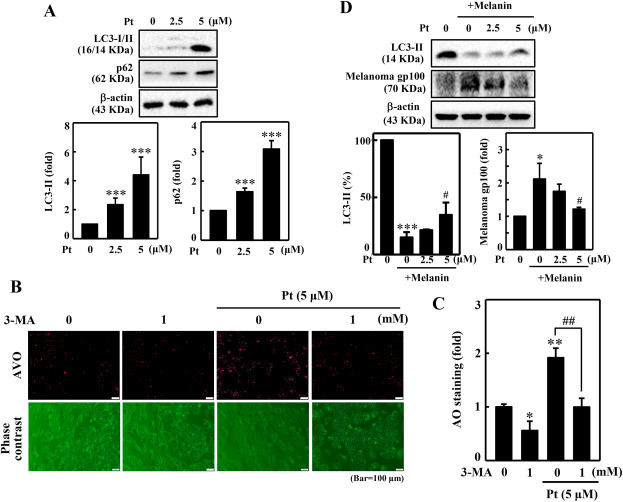 Fig. 4 Pt induced autophagy in HaCaT cells. Diverse concentrations of Pt (0–5 μM, 24 h) were treated to HaCaT cells - (A) The change of LC3-I to LC3-II and p62 protein expressions were measured through the Western blot method. Data were expressed as fold differences over untreated control cells. The β-actin protein functioned as a loading control. (B–C) Pt increased AVO formation – 3-MA (1 mM, 1 h) pretreated HaCaT cells were incubated with Pt (5 μM, 24 h). A fluorescence microscope (under red filter) was used to visualize the intracellular AVOs (Bar = 50 μm). AVO number is proportional to the intensity of red fluorescence. Values were quantified using Olympus Softimage Solution software. Data were denoted as fold differences over control (untreated) cells. (D) Pt decreased gp100 levels – B16F10 cells were stimulated with α-MSH (1 μM, 72 h). After incubation, the medium was separated and centrifuged at 1200 rpm for 5 min to collect the supernatant (containing melanin). 2 mL of this supernatant was treated to HaCaT cells (grown in 60 mm dish) and incubated for 72 h. Later, HaCaT cells were treated with Pt (2.5 or 5 μM, 24 h). The Western blot technique measured the LC3-II and melanoma gp100 proteins expression. β-actin functioned as an internal control protein. LC3-II data were denoted as percentage difference over untreated control. Melanoma gp100 protein data were denoted as fold-difference over untreated control. All results were denoted as mean ± SD of three or more independent experiments. Statistical significance was considered as *p < 0.05, **p < 0.01, ***p < 0.001 compared to untreated control cells. #p < 0.05, ##p < 0.01 compared to melanin alone or Pt alone treated cells.