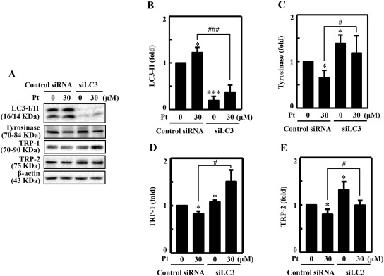 Fig. 11 LC3 knockdown diminished Pt-mediated anti-melanogenic proteins expression in B16F10 cells. Transfection experiment was conducted as described in the methodology. The LC3 expression was silenced using a specific siRNA against LC3. Non-silenced cells functioned as control. (A–E) Transfected cells were treated with 30 μM Pt for the indicated time points to allow the expression of LC3 (24 h) (B), tyrosinase (24 h) (C), TRP-1 (24 h) (D), and TRP-2 (24 h) (E) proteins in both non-silenced (control siRNA) and siLC3 cells. After incubation, cells were harvested, and cell lysate was subjected to the Western blot technique. The β-actin protein functioned as a loading control. Results were denoted as mean ± SD of three or more independent experiments. Statistical significance was considered as *p < 0.05 ***p < 0.001 compared to control siRNA cells and #p < 0.05, ###p < 0.001 compared to Pt-treated control siRNA cells.