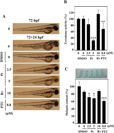 Fig. 14 Pt suppresses melanogenesis in 72 hpf zebrafish embryos. 72 hpf zebrafish embryos were incubated with vehicle (0.1% DMSO) or Pt (2.5 and 5 μM) or Rv (10 μM) for 24 h (72 + 24 hpf). 1-phenyl-2-thiourea (PTU, 8.8 μM) functioned as a positive control. A stereomicroscope was used to measure the endogenous body pigmentation (A). The method for estimating tyrosinase enzyme activity. (B) and melanin contents (C) was explained in the methodology. Results were calculated from three or more independent experiments. Data were denoted as percentage differences over untreated control zebrafish embryos. Statistical significance was considered as *p < 0.05, **p < 0.01, ***p < 0.001 compared to untreated zebrafish embryos.