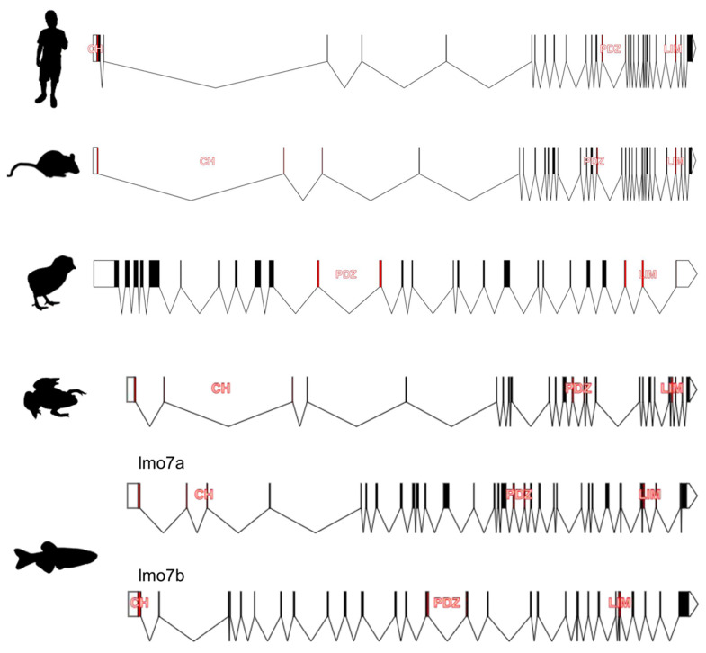 Comparison of the exon–intron organization of the LMO7 transcripts predicted for human and vertebrate model organisms (mouse, chicken, Xenopus and zebrafish). Location of the calponin (CH), PDZ and LIM zinc-binding (LIM) domains is shown for all the species. The CH domain is missing in the chicken LMO7 transcript. The longest transcripts predicted for the two zebrafish lmo7 ortholog genes (lmo7a and lmo7b) are depicted.