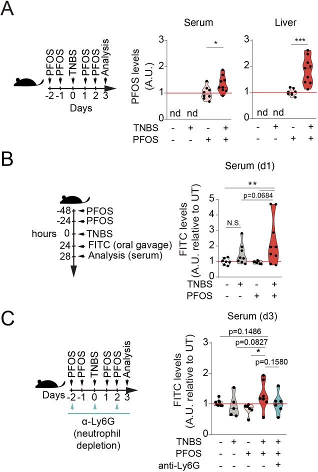 PFOS exposure during colitis leads to increased systemic levels and intestinal permeability in mice. (A) Violin plots represent normalized PFOS levels detected in serum (middle) and liver (right) at day 3 after TNBS administration, following the experimental outline shown in the scheme (left). Values have been calculated as fold change of the average concentration detected in the PFOS group of each experiment. Values for vehicle and TNBS groups were not detected (nd). n=8-9, three experiments. (B) Intestinal permeability to 4 kDa FITC-Dextran measured in serum at 4 h after oral gavage at day 1 following TNBS administration and PFOS (5 mg/kg/total dose), following the experimental outline shown in the scheme. Data shown in violin plots relative to the average of the values of the vehicle group in each experiment. n=7-9, three experiments. (C) Mice received a single dose of TNBS (1%, in 50% ethanol, intrarectally administered), four doses of PFOS (10 mg/kg/total dose, orally gavaged) and 500 µg per dose of anti-Ly6G monoclonal antibody every other day, following the experimental outline shown in the scheme. Intestinal permeability measured in serum at 4 h after oral gavage at day 3 post-TNBS administration. Data shown in violin plots are relative to the average of the values of the vehicle group in each experiment. n=5-7, three experiments. The black line represents the median. N.S., not significant; *P<0.05, **P<0.01, ***P<0.001. One-way ANOVA with Fisher's LSD test.