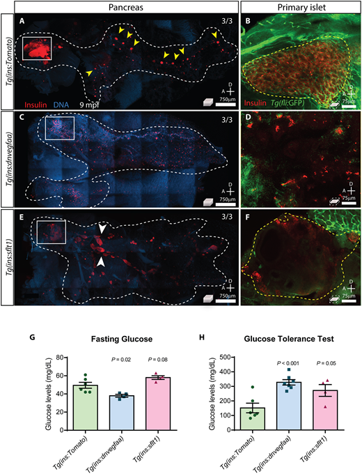 Fig. 4 β-Cell-specific expression of dnVegfaa or sFlt1 influences islet architecture and function in adult stages. (A,C,E) Whole-mount immunostaining for β-cells (insulin, red) in pancreas (white dashed outline) and intestine from 9 months postfertilization (mpf) zebrafish after CLARITY-based tissue clearing. Yellow arrowheads point to secondary islets along the pancreatic duct. White arrowheads point to sheets of β-cells along the ducts observed in Tg(ins:sflt1) animals. Maximum projection images are presented. (B,D,F) Whole-mount immunostaining for β-cells (insulin, red) and vasculature (green) in the primary pancreatic islet (magnification of white boxed areas in A,C and E, respectively). Images are single confocal planes. Yellow dashed line outlines the primary pancreatic islet. (G) Fasting blood glucose levels in adult zebrafish, measured after three days of fasting, n=4-6 animals. (H) Blood glucose levels in adult zebrafish, 90 min after intraperitoneal administration of a glucose bolus, n=4-7 animals. Data are mean±s.e.m.; individual data points are shown. P-values from t-tests are presented. A, anterior; D, dorsal.
