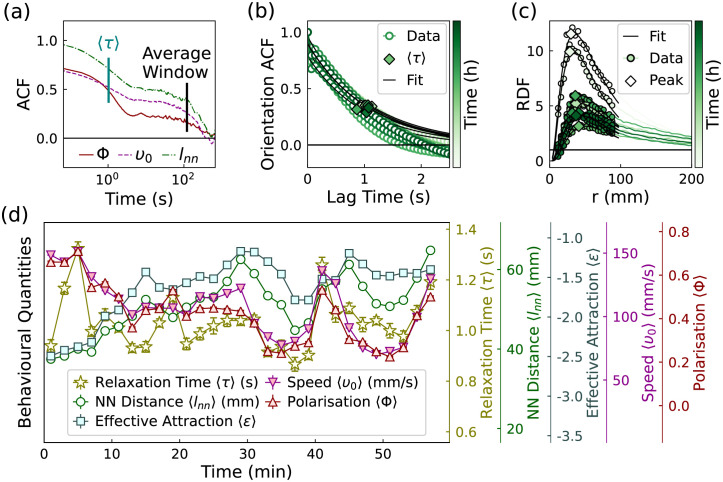 Fig 2 A: The auto–correlation function of the polarisation and average speed of the fish group. B: The auto–correlation function of the orientations of fish. C: Sequence of radial distribution functions with increasing time: at early times (top curves) the fish are clustered together so that the peak is large; at later times (bottom curves) the local density decreases and so does the peak height. D: The time evolution of the averaged behavioural quantities for 50 young fish. Each point corresponds to the average value in 2 minutes. The error bars illustrate the standard error values