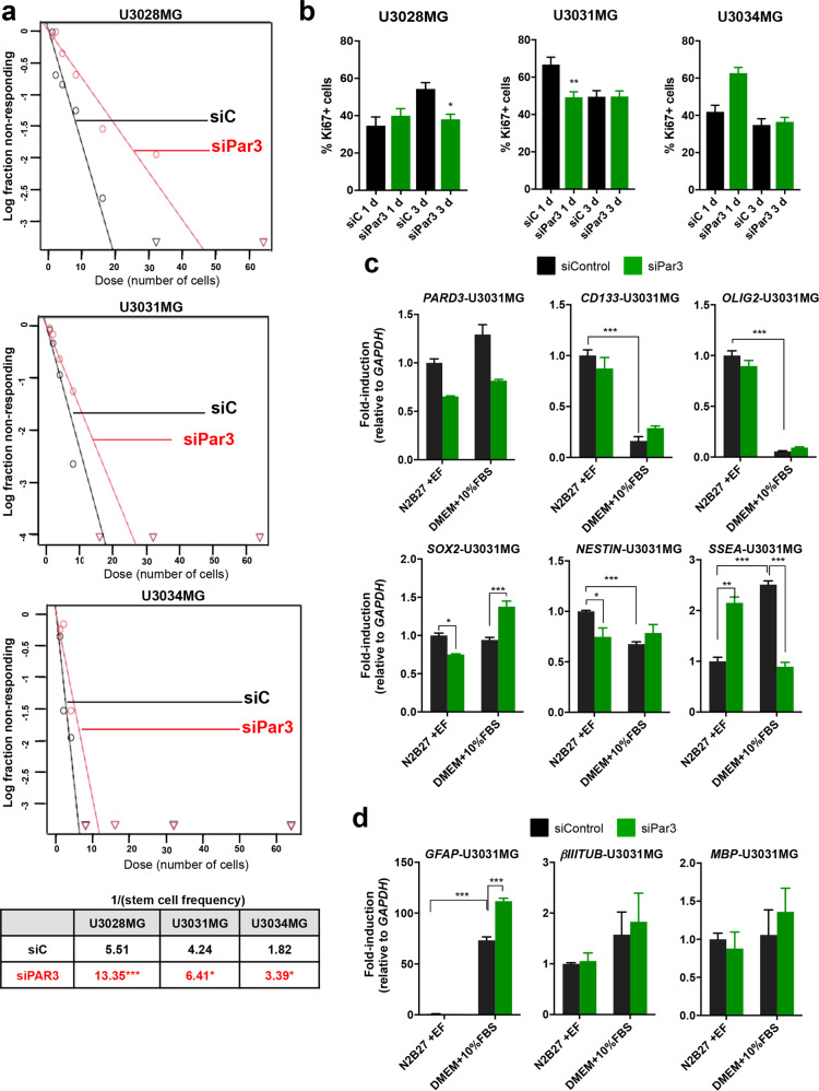 U3028MG, U3031MG, and U3034MG cells were transfected with control and Par3 siRNA. a ELDA expressing median values from transfected cells (siControl, black curves; siPar3, red curves). High x-axis intercept corresponds to low number of gliomaspheres; note the large degree of shift of the median curves to the right upon Par3 silencing. The table shows the stem cell frequency (1 stem cell/x cells). For U3028MG and U3034MG: n = 2 with seven replicates, and for U3031MG: n = 4 with seven replicates. b Percentage of Ki67-positive cells in U3028MG, U3031MG and U3034MG cultures. Average measurements of n = 2 (U3028MG), n = 3 (U3031MG), n = 5 (U3034MG) independent experiments, 10−15 pictures analyzed per experiment, and associated SEM are plotted (siControl, black bars; siPar3 green bars). Statistical comparison (one-way Anova) indicates significant differences, **p < 0.01, ***p < 0.001. c, d Expression of the indicated genes in cells cultured in N2B27 plus EGF/FGF2 (N2B27 + EF, stem cell medium) or DMEM/10% FBS after 5 days of treatment; results are mean ± S.E.M. of two independent experiments with technical triplicates. Statistical comparison (one-way Anova); significant differences, *p < 0.05, ***p < 0.001.