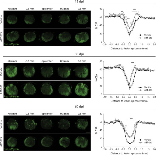 Fig. 4 White matter sparing is increased after targeting senescent cells with ABT-263 Transversal sections at different distances from the lesion epicenter of an injured spinal cord at 15, 30 and 60 dpi, treated with vehicle or ABT-263, and stained with FluoroMyelin (green) and the corresponding quantifications. White matter sparing was assessed by normalizing the area stained with FluoroMyelin (green) to the total cross-sectional area (CSA) of spinal cord sections every 100 μm ranging from 2 mm rostral and 2 mm caudal to the lesion epicenter. Scale bars, 500 μm. n (15 dpi) = 3–4; n (30 dpi) = 3–4; n (60 dpi) = 2–3. Data are expressed as % CSA and presented as mean ± SEM. ∗p < 0.05, ∗∗p < 0.01, ∗∗∗p < 0.001, ABT-263 versus vehicle.
