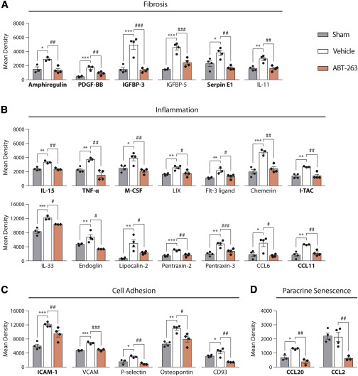 Fig. 7 Targeting SCs with ABT-263 reduces key pro-inflammatory and pro-fibrotic factors that are induced upon spinal cord injury (A–D) Cytokine and chemokine expression was measured in spinal cord homogenates from laminectomized (sham), vehicle-, and ABT-263-treated animals at 15 dpi. From a total of 111 factors analyzed, 26 were both upregulated upon injury (sham versus vehicle) and significantly decreased after ABT-263 treatment (vehicle versus ABT-263). Factors were divided in different groups regarding their role in (A) fibrosis, (B) inflammation, (C) cell adhesion, or (D) paracrine senescence. Some of the identified factors, displayed in bold, have been previously described as SASP factors. Data are expressed as mean density and presented as mean ± SEM. ∗p < 0.05, ∗∗p < 0.01, ∗∗∗p < 0.001, vehicle versus sham; #p < 0.05, ##p < 0.01, ###p < 0.001, ABT-263 versus vehicle.