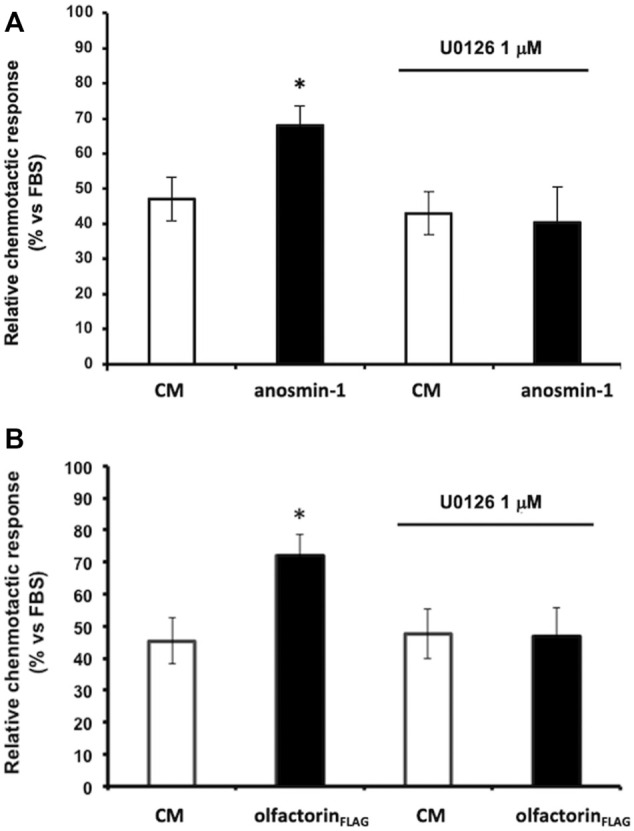 Effect of the ERK1/2 signaling pathway inhibitor on anaosmin-1- and olfactorinFLAG-induced GN11 chemomigration. GN11 cells were pretreated with ERK1/2 inhibitor U0126 (1 µM) and then to the exposed control CM, anosmin-1