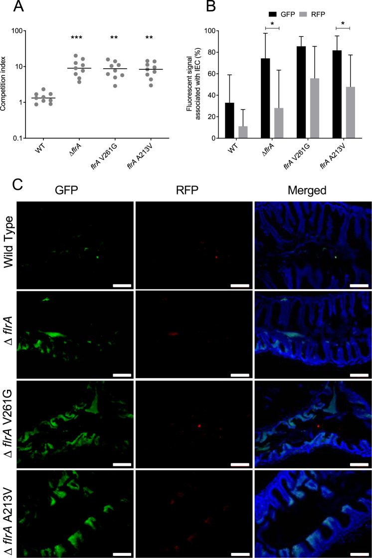 Fig. 5 A CI of adapted isolates with mutations in flrA in zebrafish infection model was calculated by dividing the output ratio of test strain (e.g. flrA mutants) to ∆lacZ after infection corrected by the input ratio. Data are from nine independent biological replicates and are shown as the median. Statistical significance was determined by one-way ANOVA and Kruskal–Wallis test and is indicated by ∗∗∗p < 0.001 and ∗∗p < 0.01. B Quantification of bacterial fluorescence associated with intestinal epithelial cells of zebrafish after infection. Data are presented as percentages of GFP (test strain) and RFP (∆lacZ mutant) signal quantified by fluorescent pixel count of tissue sections in ImageJ. Statistical significance was determined by one-way ANOVA and Tukey’s multiple comparison test and is indicated by ∗p < 0.05. C Colonisation of adapted isolates in adult zebrafish intestine. The four panels show representative fluorescence microscopy images of intestinal epithelial cell of adult zebrafish colonised with the indicated bacteria tagged with GFP and ∆lacZ strain tagged with RFP. Scale bars: 100 µm.
