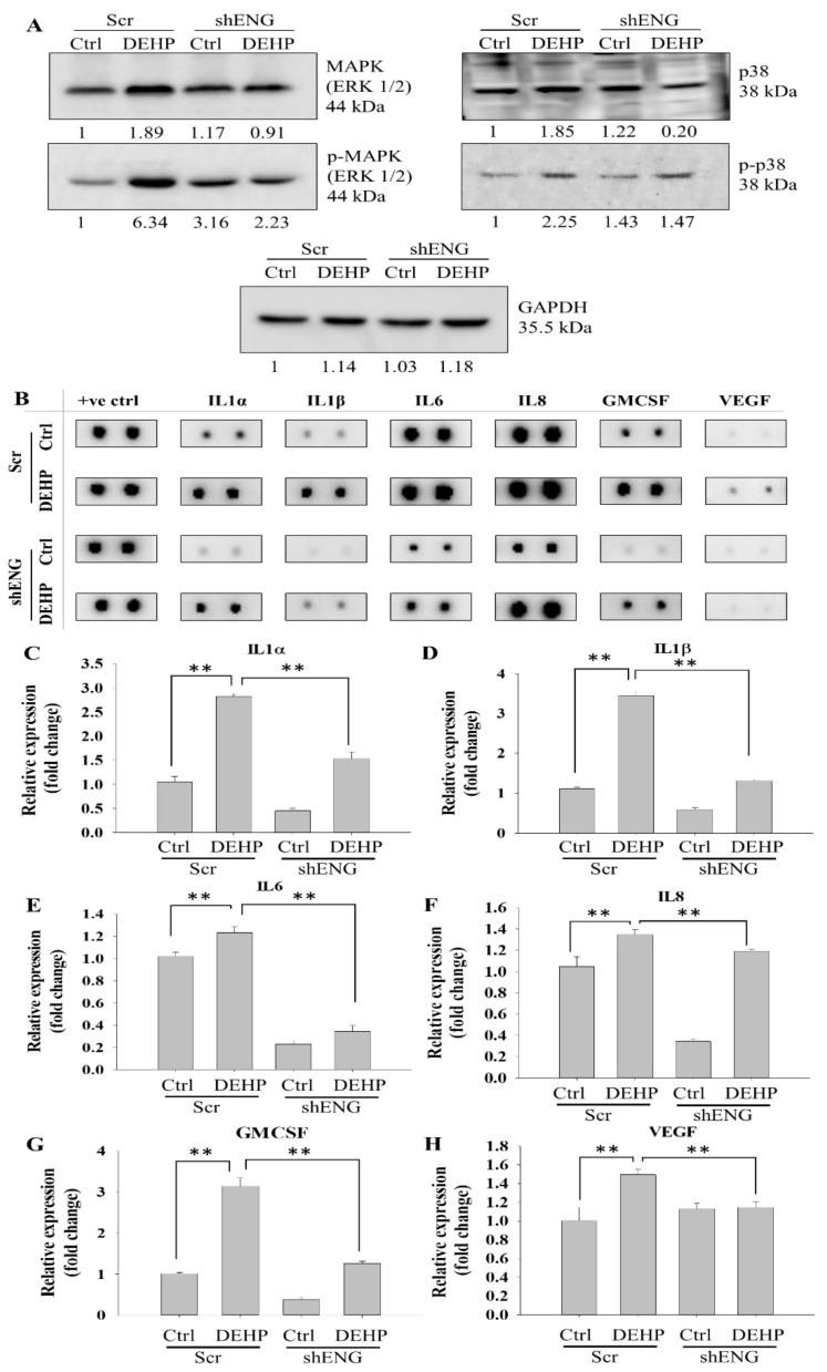 Figure 6 Representative and quantitative results of endoglin-mediated MAPK/p38 signaling and cytokine regulation. (A) Western blotting results showing upregulation of MAPK, phospho-MAPK, p38, and phospho-p38 in DEHP-treated MDA-MB-231 cells, and endoglin reversed protein expression. (B) Representative results of the antibody angiogenesis array showing endoglin-mediated expression of the inflammatory cytokines GMCSF and VEGF. (C–H) Quantification of the expression of IL1α, IL1β, IL6, IL8, GMCSF, and VEGF in control and DEHP-exposed MDA-MB-231 cells (mock- and shENG-treated). +ve ctrl: positive control; ** p < 0.001.