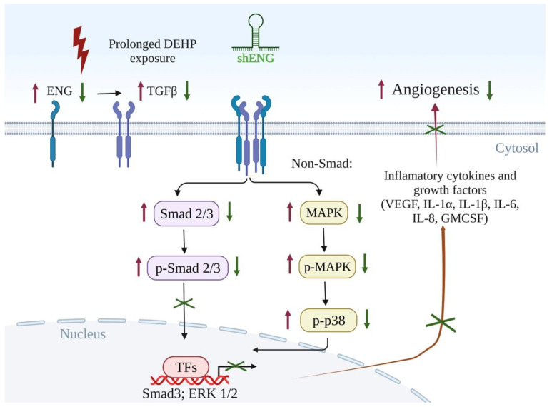 Figure 7 Schematic representation of prolonged DEHP exposure-induced angiogenesis potential in breast cancer cells. Prolonged DEHP exposure at physiological concentrations upregulate the expression of endoglin (ENG). Endoglin overexpression activates TGFβ and MAPK/p38 signaling-mediated production of VEGF; inflammatory cytokines IL1α, IL1β, IL6, IL8; and GMCSF, contributing to enhanced DEHP-induced angiogenesis potential in breast cancer cells. shRNA mediated ENG knockdown reversed ENG induced angiogenesis through downregulation of TGFβ and MAPK/p38 signaling along with reduced expression of inflammatory cytokines IL1α, IL1β, IL6, IL8; and GMCSF.