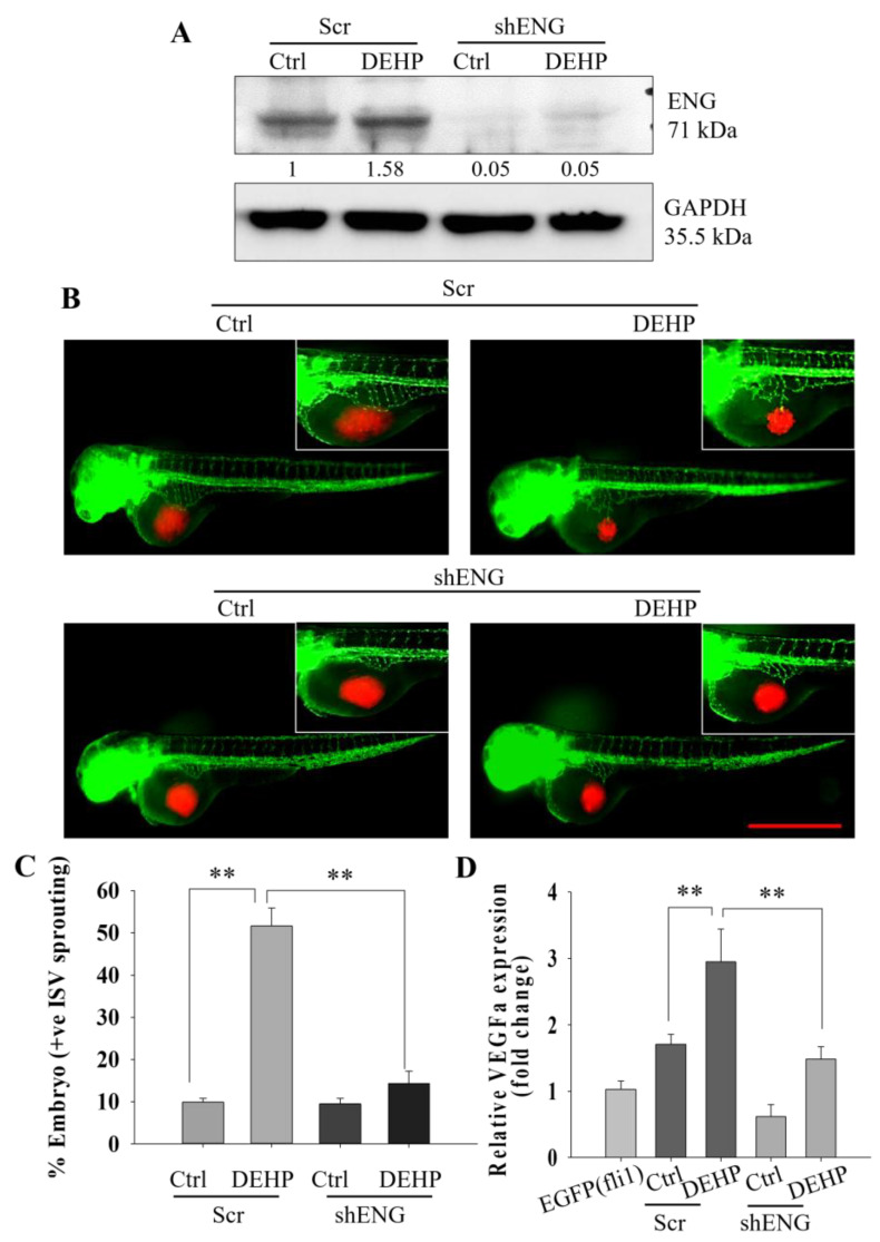 Figure 3 Representative and quantitative results showing that DEHP-induced endoglin-controlled VEGFA-mediated angiogenesis in vivo. (A) Prolonged DEHP treatment upregulated endoglin expression in MDA-MB-231 cells, and shENG treatment depleted endoglin expression in control and DEHP-exposed MDA-MB-231 cells. (B) Endoglin knockdown reduced DEHP-induced SIV sprouting in Tg (fli1: EGFP) zebrafish embryos at 24 hpi. Scale bar =1000 µm. (C) Quantitative results of angiogenesis showing a reduced number of zebrafish embryos showing SIV sprouting following endoglin knockdown (n = 50). (D) Depletion of VEGFA mRNA levels in zebrafish embryos following endoglin knockdown cell xenografts of DEHP-exposed MDA-MB-231 cells; ** p < 0.001.