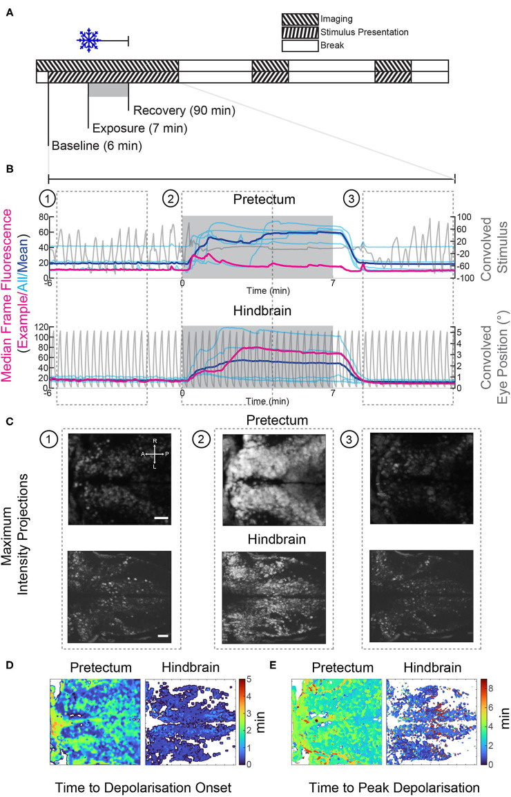 Gradual cooling induced a calcium surge in both the pretectum and hindbrain of exposed larvae. (A) Stimulus and imaging paradigm for calcium imaging experiments carried out in both the pretectum and hindbrain. (B) Median frame fluorescence for pretectal and hindbrain recordings; traces for individual recordings are shown in cyan and the mean values are shown in blue. The fluorescence trace for a single recording in the pretectum and hindbrain is shown in red, the convolved eye trace and convolved stimulus for the example recordings are also shown in gray. (C) Maximum intensity projections at different time points from the example recordings shown in red in (B). 1: before cooling, 2: during cooling to 11°C, 3: recovery 1:30 to 5:40 min after cooling ceased. Scale bars: 30 μm. (D) The onset of the calcium surge was calculated in stimulus-correlated (regressor score >0.5) pixels. This onset was defined as the first time point at which the fluorescence was >5 standard deviations above the baseline. (E) The time point at which correlated pixels reached their highest pixel intensity. A, anterior; P, posterior; L, left; R, right.