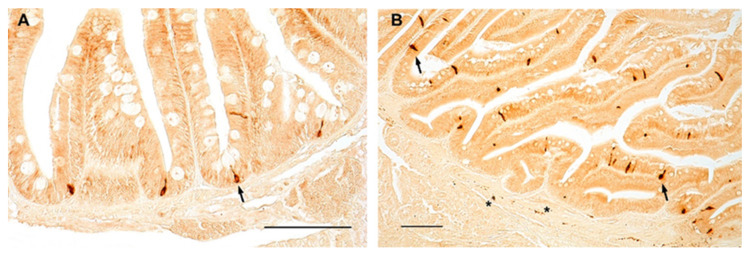Figure 4 Figure 4. NPY immunoreactivity in the foregut of zebrafish. Transverse sections of the foregut of 6-month-old zebrafish showing NPY immunopositivity in the cytoplasm of enteroendocrine cells (arrows) (A,B) and in varicosities in the myenteric plexus (asterisks) (B).