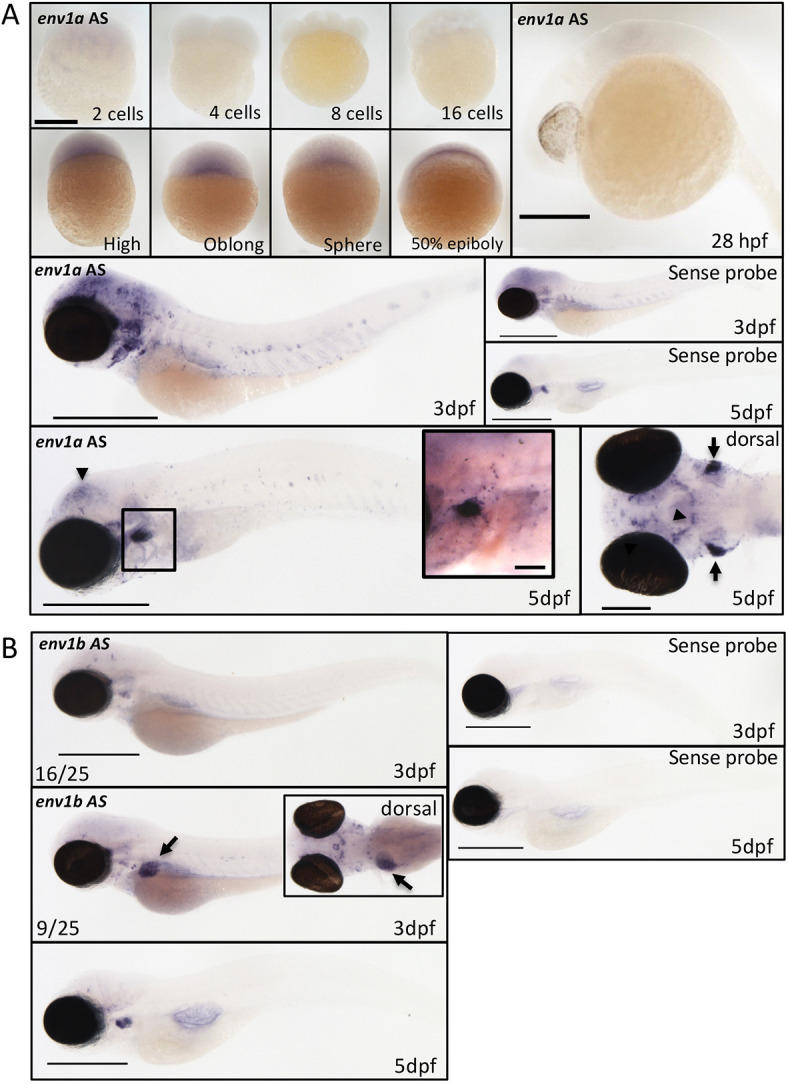 Reporter line for zferv1a recapitulates endogenous expression. (A) Expression of the envelope gene (env) of zferv1a (called env1a here) using antisense (AS) and sense in situ hybridisation RNA probes from the two-cell stage until 5 dpf (black arrowheads point to brain expression). Scale bars: 500 µm unless specified otherwise. Bottom left panel shows dorsal view of env1aAS expression in the brain (black arrowheads) and thymus (black arrows). Scale bar: 200 µm. Inset shows a magnified image of the thymus area (boxed), highlighting strong expression around the thymus with single positive cells visible in the vicinity of the thymus around the ear and alongside the branchial arches. Scale bar: 70 µm. (B) Expression of the envelope gene (env) of zferv1b (called env1b AS here) by in situ hybridisation at 3 dpf and 5 dpf. Liver expression is highlighted by black arrows. Inset shows dorsal view of the asymmetric liver expression. Scale bars: 500 µm.