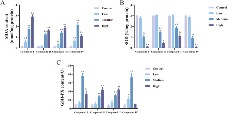 Fig. 7 The analysis of oxidative damage of zebrafish embryos. (A) The contents of MDA of zebrafish embryos. (B) The GSH-PX value of zebrafish embryos after treatment. (C) The SOD value of zebrafish embryos in each group. Values were expressed as mean ± SD of three independent experiments. * p < 0.05, ** p < 0.01 versus control group.