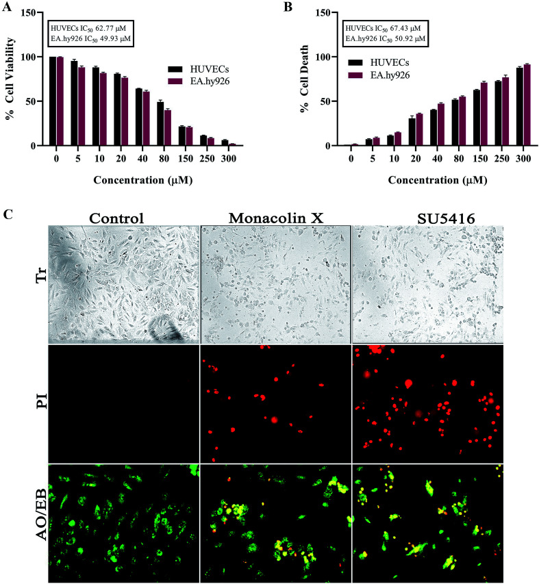 Fig. 1 (A) Represents WST assay to check for antiproliferative and cytotoxic nature of monacolin X on human endothelial cells-HUVECs and EA.hy926. All the cells were treated with monacolin X at various concentrations (0–300 μM) for 24 h. (B) Cell membrane integrity by release of lactate dehydrogenase (LDH) activity by LDH assay. HUVECs and EA.hy926 cells were treated with monacolin X at various concentrations (0–300 μM) for 24 h. LDH released into the medium was measured along with blank, untreated cells (0 μM), had low LDH release in media and whereas treated cell had dose dependent release of LDH. (C) The morphological analysis of HUVECs treated with monacolin X at IC50 concentration (62.77 μM) for 24 h. Control, monacolin X treated and SU5416 treatment respectively. Morphological changes of control and monacolin X treated HUVECs cells evaluated with PI staining by fluorescence microscopy. The percentage of necrotic nuclei after 24 h treatment with monacolin X treated increased enormously, as revealed by nuclear condensation and fragmentation. Apoptotic and nuclear morphological changes in HUVECs cells treated with monacolin X evaluated with AO/EB dual staining.