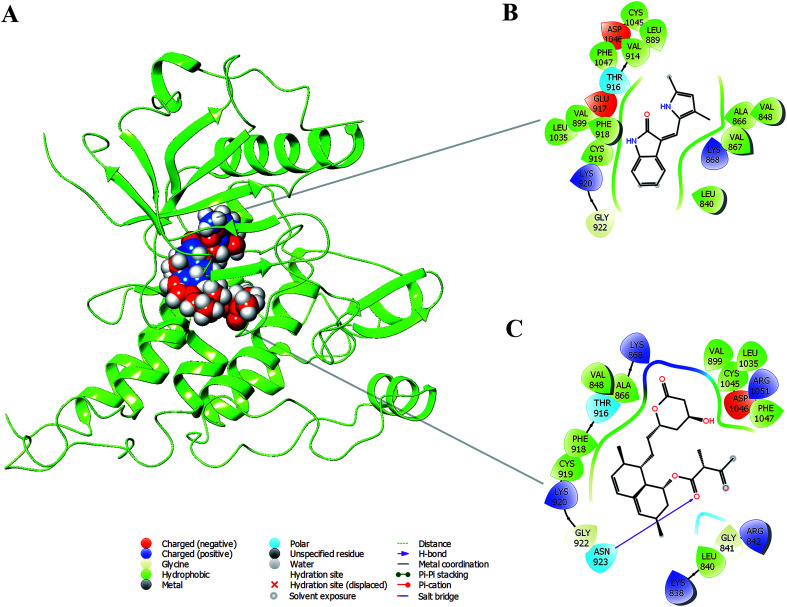 Fig. 9 Fig. 9 (A) Binding modes of SU5416 and monacolin X inside the active pocket of the VEGFR2 (B) & (C) LigPlot depicting the interaction profiles of SU5416 and monacolin X with the active pocket amino acids after docking studies.