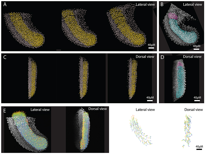 Tracks were generated of the whole tailbud and all non-paraxial mesoderm tracks were then manually removed. Paraxial mesoderm (PM) tracks (yellow spots) and non-paraxial mesoderm tracks (grey spots) shown at 0, 1, and 2 hours after imaging. (B) PM spots reconstructions (cyan: PSM & pink: nascent somite) from a similar-stage HCR image is shown for comparison/validation of selection accuracy. (C, D) The same images as above, but from a dorsal view: anterior is top, medial is left. (E) All PM tracks of full movie (colour-coded by time) superimposed over first frame image, shown for lateral and dorsal views (left images), and a sub-set of tracks shown in isolation, for lateral and dorsal views (right images).