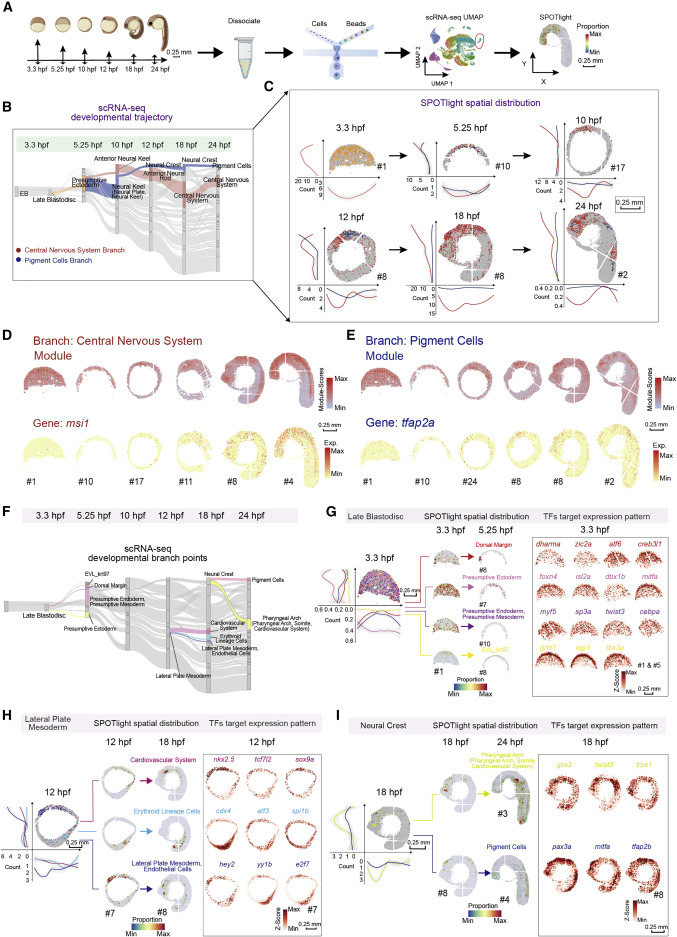 Fig. 4 Figure 4. Construction of the spatially resolved developmental trajectories by integrated analysis of the scRNA-seq and Stereo-seq data (A) Schematic representation of the workflow for scRNA-seq of zebrafish embryos at different developmental stages using the C4 system and integrated analysis with a combination of the scRNA-seq and Stereo-seq data by applying SPOTlight. Scale bars, 0.25 mm. (B) Application of a Sankey diagram to visualize zebrafish embryo developing trajectory with scRNA-seq data. Two developmental branches which are developed from the presumptive ectoderm, namely, pigment cells, and central nervous system are simultaneously displayed on the Sankey diagram. (C) Application of SPOTlight to integrate Stereo-seq with scRNA-seq data to infer the spatially resolved developmental trajectories. Two developmental branches shown in (B) are simultaneously displayed on six sequential spatial sections to show the different spatial developmental trajectories. The graphs next to each section show bin counts distributions of corresponding cell types at two dimensions. The color legend is the same as that in Figure 4B. Scale bars, 0.25 mm. (D and E) Distribution of branch-specific gene module (top) and individual representative DEGs (bottom) of the central nervous system branch (D) and the pigment cells branch (E) on six sequential spatial sections. Scale bars, 0.25 mm. (F) Three selected developmental branch points at 3.3-, 12-, and 18-hpf. The late blastodisc (left), the lateral plate mesoderm (middle) and the neural crest (right), are shown in the Sankey diagram. (G–I) Cell-fate regulatory maps of different developmental destinations at 3.3-, 12-, and 18-hpf are related to Figure 4F. SPOTlight was applied to visualize the spatial distribution of cell subgroups with different differentiation together on one section (left) and separately on each section (middle); the graphs next to each section show bin counts distributions of corresponding cell types at both x and y axes (left). The spatial expression distributions of selected representative crucial TFs target genes are visualized on embryonic sections (right). Scale bars, 0.25 mm.