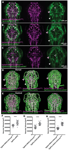 Segmentation of different transgenic lines. (A-C) In all three double transgenics [(1) Tg(fli1a:eGFP)y1, Tg(kdrl:HRAS-mCherry)s916, (2) Tg(fli1a:CAAX-eGFP), Tg(kdrl:HRAS-mCherry)s916, and (3) Tg(fli1a:LifeAct-mClover)sh467, Tg(kdrl:HRAS-mCherry)s916] nonvascular signal was observed in the fli1a-driven transgenic (arrowheads). (D-E) Segmentation results of the three double transgenics showed nonvascular signals to be enhanced and segmented in the transgenics under the fli1a promotor. (F) Vascular volume in Tg(fli1a:eGFP)y1 was statistically significantly higher than in Tg(kdrl:HRAS-mCherry)s916 (p < 0.0001; n = 21; paired t-test). (G) Vascular volume in Tg(fli1a:CAAX-eGFP) was statistically significantly higher than Tg(kdrl:HRAS-mCherry)s916 (p < 0.0001; n = 17; paired t-test). (H) Vascular volume in Tg(fli1a:LifeAct-mClover)sh467 was statistically significantly higher than Tg(kdrl:HRAS-mCherry)s916 (p < 0.0001; n = 23; paired t-test).