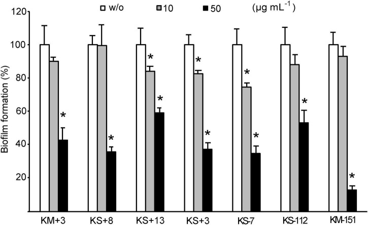 Effects of YtnP-ZP1 on biofilm formation in environmental isolates. Values are plotted relative to buffer-treated control (w/o) and are representative of three independent experiments ± SD. *P < 0.05.
