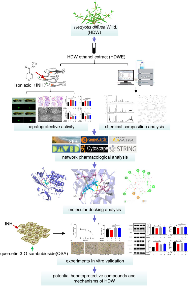 Fig. 1 A framework for investigating the hepatoprotective effects of HDW in INH-induced liver injury in the zebrafish model and predicting the bioactive compounds molecular mechanisms.