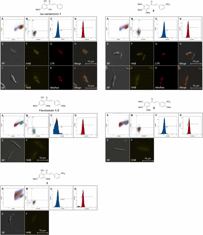 Fig. 5. Cytometric quantification and microscopic fluorescence imaging of HAB (5 µM) in live L. amazonensis promastigotes (20,000 cells/µL) in presence of competitors 1-5 (100 µM). Co-markers were 7-AAD (40 µM), LTR (100 nM) or MitoRed (50 nM). A: morphological biparametric plot (FS, cell size; SS, cell granularity); B: gated plot (FL4: 7-AAD, FL10: HAB); C: 7-AAD cytometric histogram; D: HAB cytometric histogram; E and I: bright field (BF); F and J: HAB labelling; G: LTR labelling; K: MitoRed labelling, H and L: merge. IC50 values of competitors 1-5 are given in Table 1. Plot data are representative of three independent experiments. Means and standard deviations of cell count and fluorescence intensity data (n = 3) are indicated in Table 1.