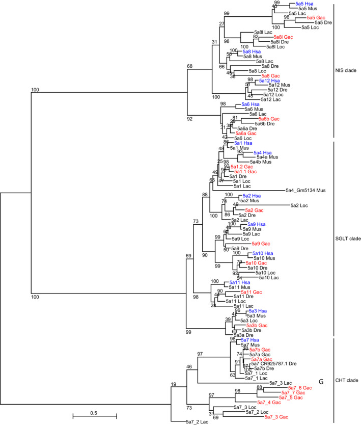 Maximum‐likelihood phylogenetic tree of Slc5a aligned amino acid sequences in representative vertebrate taxa. Phylogenetic analysis used a LG + G + F substitution model. A maximum‐likelihood tree inferred using PhyML (see Section