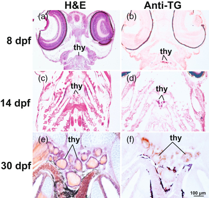 Colocalization of thyroid follicles and thyroglobulin protein at 8, 14, and 30 dpf in stickleback larvae. (a, c, e) Hematoxylin and eosin (H&E)‐stained horizontal sections of the pharynx showing thyroid follicles at 8–30 dpf. (b, d, f) Positive staining for thyroid antibody (anti‐TG [thyroglobulin]) is visible in and around the lumen of thyroid follicles at 8–30 dpf. Imaged at 400X. thy, thyroid follicles