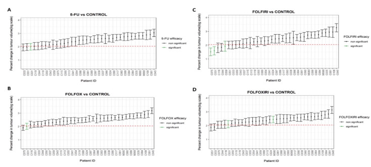 Error bars represent 95% confidence intervals of the %∆V calculated using random-effects model. Subgroup analyses for the treatment efficacy of 5-FU (