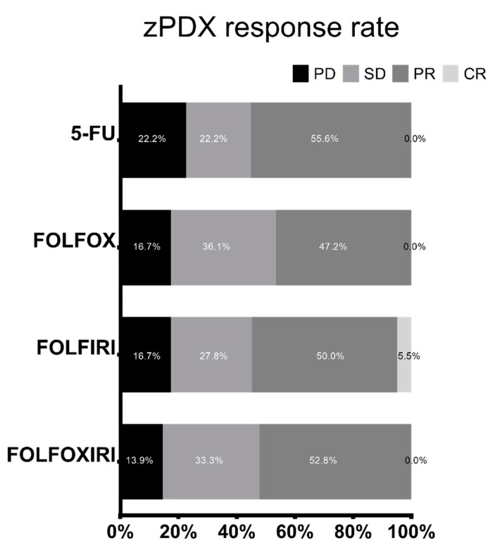 Percentage of progressive disease (PD), stable disease (SD), partial response (PR), and complete response (CR). 5-FU, FOLFOX, FOLFIRI and FOLFOXIRI treatments in zebrafish avatars xenotransplanted with colorectal tumor (n = 36 patient samples analyzed).
