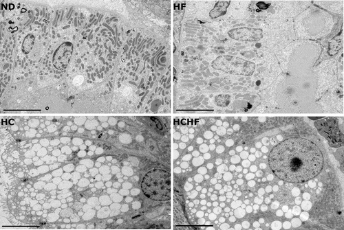 Figure 5.High-calorie and high-calorie, high-fat diets led to ectopic lipid deposition and displacement of organelles. Transmission electron microscopy of proximal tubules from fish fed the normal-calorie diets (normal diet and high-fat diets) showed evenly spaced cells with elongated mitochondria distributed throughout the cell and few endocytic vesicles. In contrast, proximal tubule cells in the high-calorie diets (high-calorie and high-calorie, high-fat diets) had bulging apical membranes and cytoplasm filled with lipid droplets, displacing the nucleus and mitochondria to the basal portion of the cell. Scale bars = 5 µm. HC, high-calorie diet; HCHF, high-calorie, high-fat diet; HF, high-fat diet; ND, normal diet.