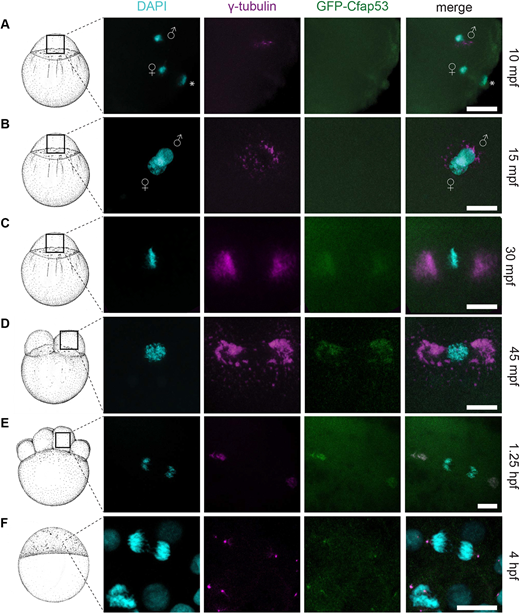 GFP-Cfap53 localization during cleavage stages. (A-F) Maximal projections of confocal stacks from Tg(ubi:GFP-cfap53) embryos immunolabelled for GFP, γ-tubulin and DAPI from 30 mpf until 4 hpf. (A) At 10 mpf, male and female pronuclei and the female polar body are visible. Some γ-tubulin foci around the male pronucleus can been observed, while GFP-Cfap53 has a diffuse localization (A, n=7). (B) At 15 mpf, both pronuclei are almost fused and some γ-tubulin can be observed around the nuclei, while GFP-Cfap53 localization is still diffuse (B, n=7). (C) At 30 mpf, chromosomes have aligned along the metaphase plate and strong γ-tubulin staining can be observed on either side of it. At this moment, GFP-Cfap53 also starts to localize to both sides of the metaphase plate, where it colocalizes with γ-tubulin (C, n=12). (D) At 45 mpf, the first cell division has completed and one of the two nuclei is shown. Both GFP-Cfap53 and γ-tubulin are visible in broad domains on both sides of the nucleus during prophase (D, n=8). (E) Single cell of an eight-cell stage blastula with segregating chromosomes during telophase of mitosis. GFP-Cfap53 and γ-tubulin colocalize in a more condensed region at both sites of the division plane (E, n=7). (F) Blastula cell in telophase during mitosis at the sphere stage (4 hpf). GFP-Cfap53 and γ-tubulin colocalize to a confined region on both sides of the division plane (F, n=1). Asterisks indicate polar bodies. Gender symbols indicate male or female pro-nucleus. Scale bars: 20 μm. Schematics of embryonic development are adapted, with permission, from Kimmel et al. (1995).