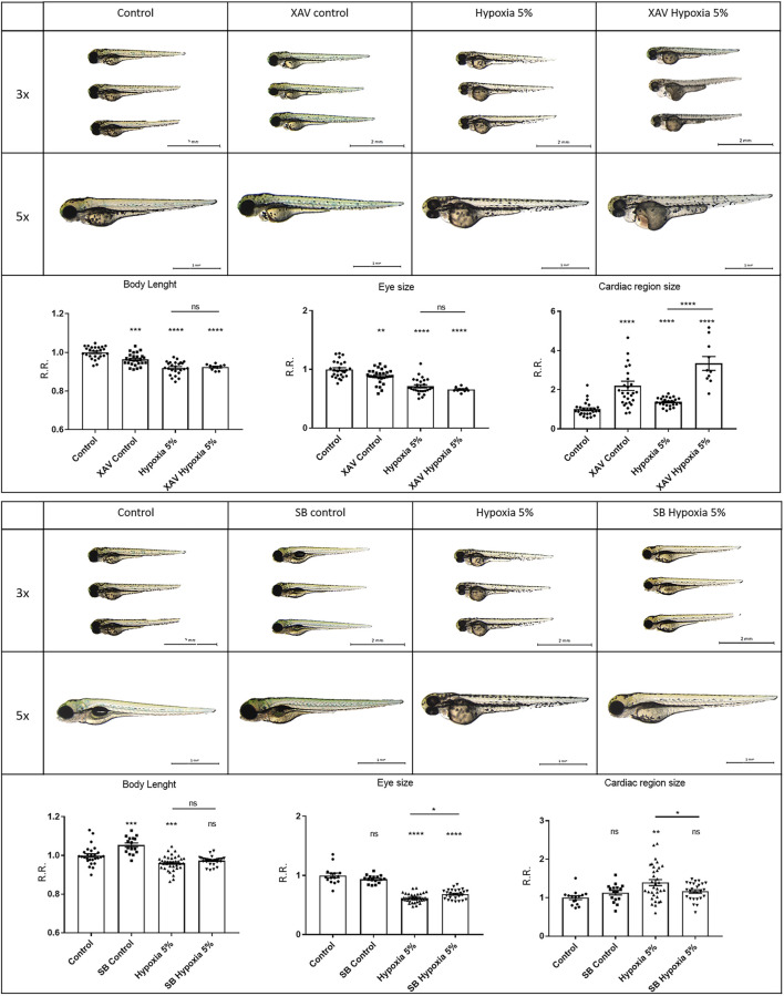 Wnt/β-catenin signalling upregulation can rescue FGR anomalies. Downregulation of Wnt/β-catenin signalling with 5 µM XAV939 (XAV) inhibitor does not rescue body length or eye size, and worsens the pericardial effusion under hypoxia. Upregulation of Wnt/β-catenin signalling with 40 µM SB216763 (SB) agonist can rescue the body length and the pericardial effusion under hypoxia. All embryos, at 3 dpf, are displayed in lateral view, anterior to the left. For display purposes, images of control embryos under normoxia and hypoxia correspond to control images of